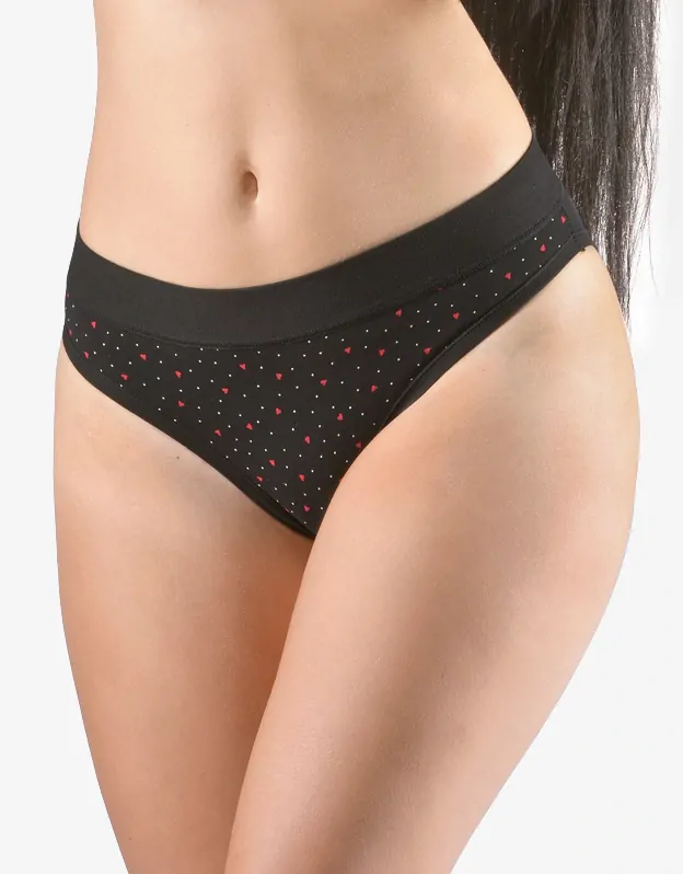Kalhotky klasického střihu s úzkým bokem a širším pasovým lemem, dámské šité prádlo. Pasový kraj je začištěný širším lemem ze stejného materiálu. Nohavičky jsou začištěné úzkým lemem ze stejného materiálu. Přední díl je potištěný. Zadní díl a lemy jsou jednobarevné.