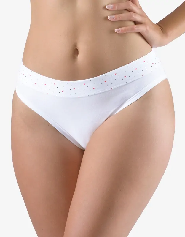 92% Bavlna 8% ElastanKalhotky klasického střihu s úzkým bokem a širším pasovým lemem, dámské šité prádlo. Pasový kraj je začištěný širším lemem ze stejného materiálu. Zdobí jej potisk s drobnými srdíčky. Nohavičky jsou začištěné úzkým lemem ze stejného materiálu.Materiál je vyroben z bavlny, která j... celý popis