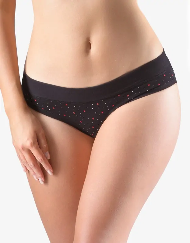 Bokové kalhotky francouzského střihu se širokým bokem a širším pasovým lemem, dámské šité prádlo. Pasový kraj je začištěný širším lemem ze stejného materiálu. Nohavičky jsou začištěné úzkým lemem ze stejného materiálu. Přední díl je potištěný. Zadní díl a lemy jsou jednobarevné.
