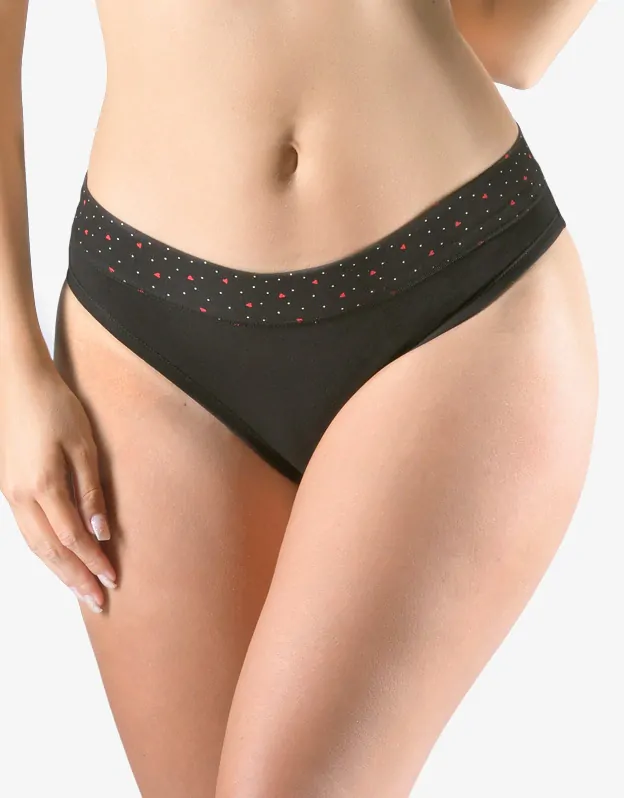 Bokové kalhotky se širším bokem, bokovky, a se širším pasovým lemem, dámské šité prádlo. Pasový kraj je začištěný širším lemem ze stejného materiálu, zdobí ho potisk s malými srdíčky. Nohavičky jsou začištěné úzkým lemem ze stejného materiálu.