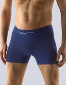 Boxerky s delší nohavičkou, pánské bezešvé prádlo. Pasový kraj je zesílený a zapravený bezešvým způsobem. Nohavičky jsou zapravené bezešvým způsobem. V rozkroku je všitý klínek. Na předním díle jsou boxerky tvarovány vypletenými zónami. Boxerky jsou jednobarevné. V záložce je vypletené logo v šedé barvě.