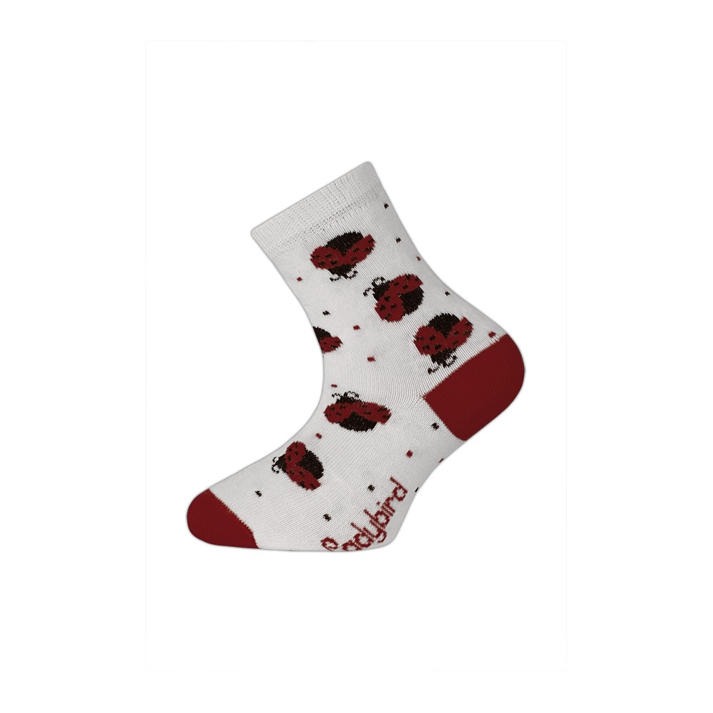 Dětské bílé ponožky s motivem berušky. Originalita, pohodlí, styl. Kousek s nápaditým vzorem, který stojí za oživení dětského outfitu všedního dne. Jsou vyrobeny z jemné bavlny a díky přidanému elastanu se skvěle přizpůsobí tvaru dětské nohy. Mají extra plochý šev v oblasti prstů a úzké komfortní lemy, které se nezařezávají. Špička a pata ponožek jsou zesílené.