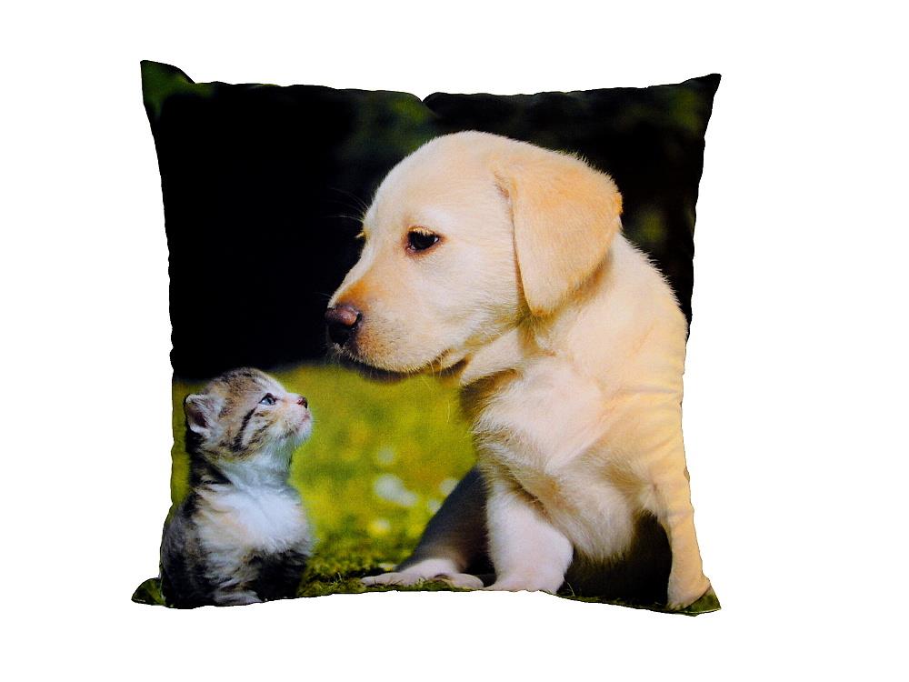 Polštářek s obrázkem koťátka a pejska. Druhá strana fotopolštářku je bílá. Rozměr polštářku je 40x40 cm.