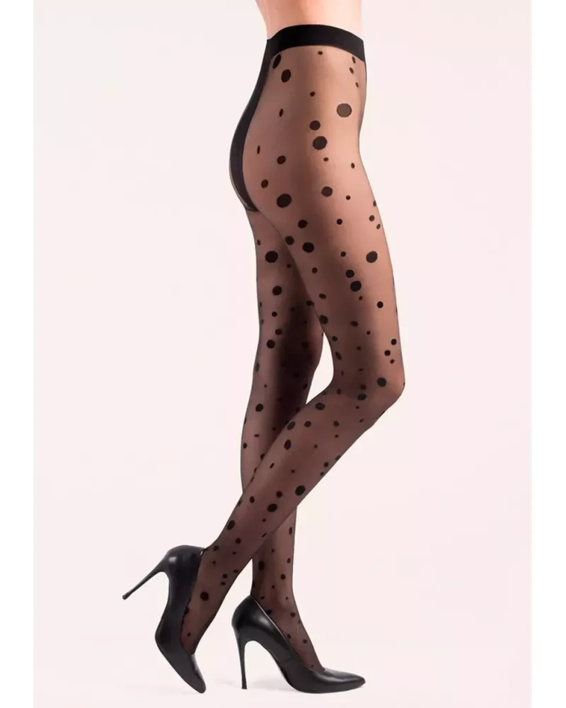 Dámské vzorované punčochové kalhoty s obsahem vlákna typu Lycra. Dámské celovzorované punčocháče zdobí vzor puntiku. Punčochové kalhoty jsou šité plochým švem, bez zesíleného sedu a vyznačené špice.