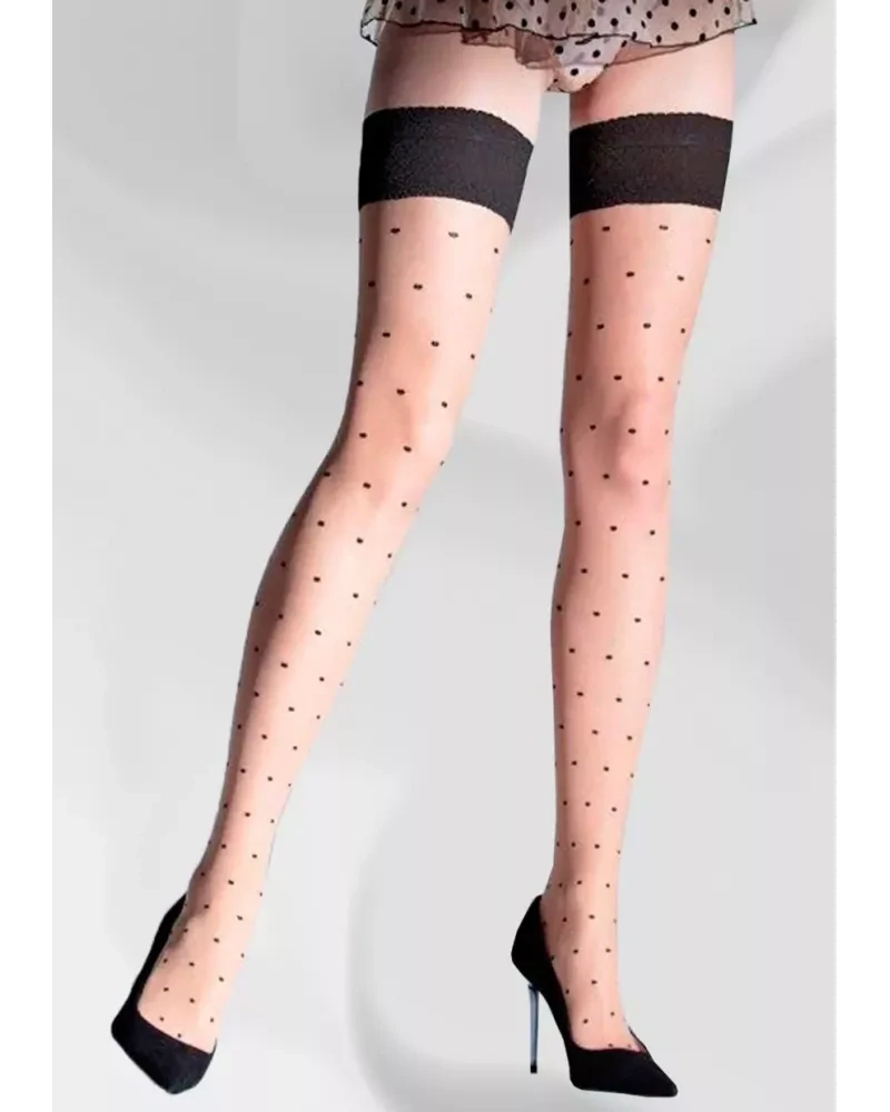 Dámské vzorované samodržící punčochy se vzorem tečky a krajkovým páskem. Punčochy jsou vyrobené ze splétané příze která zaručuje zvýšenou odolnost a maximální komfort při nošení. Punčochy Subtle mají nový druh silikonových pásků Stay4Sure které zajišťují aby punčochy drželi na správném místě po celý den.