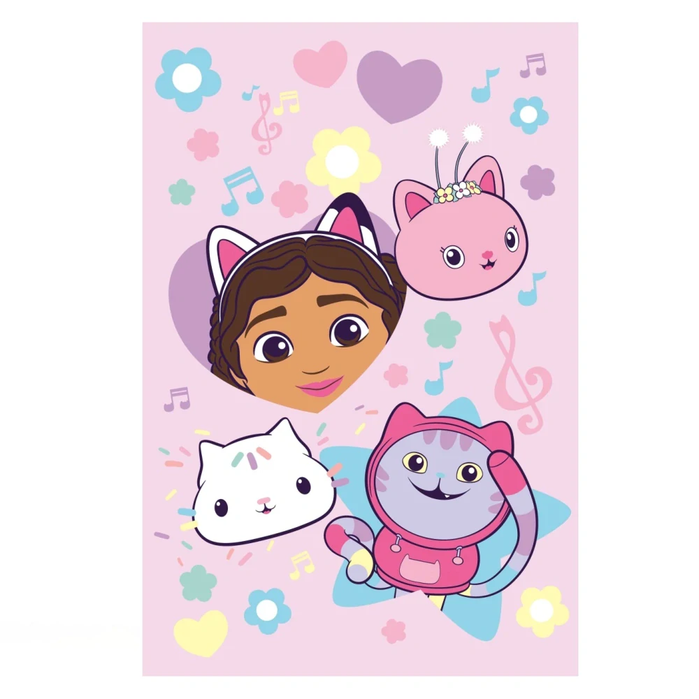 Na růžovém pozadí deky jsou vyobrazeny roztomilé postavičky z Gabbys Dollhouse, včetně několika kočiček s různými výrazy a doplňky, které dodávají dece hravý a veselý vzhled.