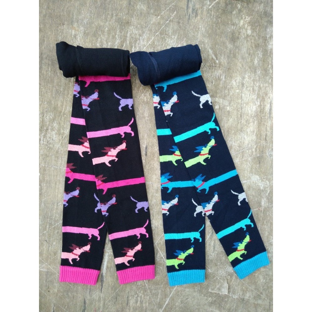 Dětské legíny s veselým jezevčíkovým vzorem. Vyrobeny z kvalitní dlouhovlákné bavlněné příze.  Pohodlné při nošení díky přidanému elastanu, který se přizpůsobí  tvarům dětských nožek.  Tyto legínky mají komfortní pas, který se nezařezává ani nesklouzává. Pro větší pohodlí při nošení je v legínkách všitý klín. Nohavice bez rušivých bočních švů. V dolní části jsou ukončeny pružným lemem.