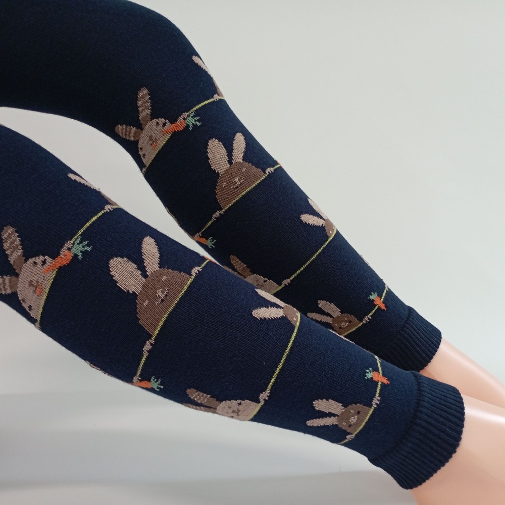 Dětské leginy se vzorem zajíců. Legíny jsou yyrobeny z kvalitní dlouhovlákné bavlněné příze. Pohodlné při nošení díky přidanému elastanu, který se přizpůsobí  tvarům dětských nožek.  Tyto legínky mají komfortní pas s všitou gumou v tunýlku, který se nezařezává ani nesklouzává. Pro větší pohodlí při nošení je v legínkách všitý klín. Nohavice bez rušivých bočních švů. V dolní části jsou ukončeny pružným emem.