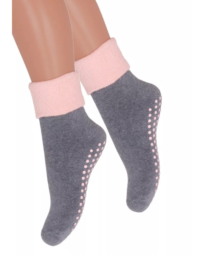 Dívčí froté bavlněné ponožky s protiskluzovým gelovým potiskem ABS 038/18 Steven. Ponožky jsou zakončené přeloženým lemem. Značka STEVEN vyrábí ponožky z vysoce kvalitní bavlněné příze, která poskytuje maximální pohodlí při nošení. Doporučujeme na podzimní a zimní období.