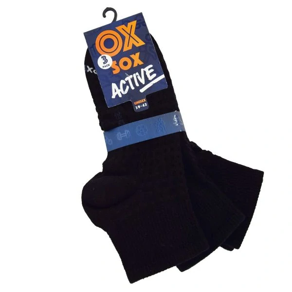 Unisex bavlněné letní kotníkové sportovní ponožky 3-pack s plastickým designem. Pohodlí zajišťuje plochý šev na špici (řetízkování) a trvanlivost ponožek pak zesílení (zdvojené pletení) v oblasti paty a špice. OXSOX ponožky skvěle drží díky své elasticitě a neškrtí díky příjemnému nesvírajícímu lemu. Sportovní design. Balení 2x3 páry. Barva: černá