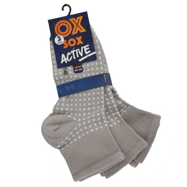 Unisex bavlněné letní kotníkové sportovní ponožky 3-pack s plastickým designem. Pohodlí zajišťuje plochý šev na špici (řetízkování) a trvanlivost ponožek pak zesílení (zdvojené pletení) v oblasti paty a špice. OXSOX ponožky skvěle drží díky své elasticitě a neškrtí díky příjemnému nesvírajícímu lemu. Sportovní design. Balení 2x3 páry. Barva: šedá