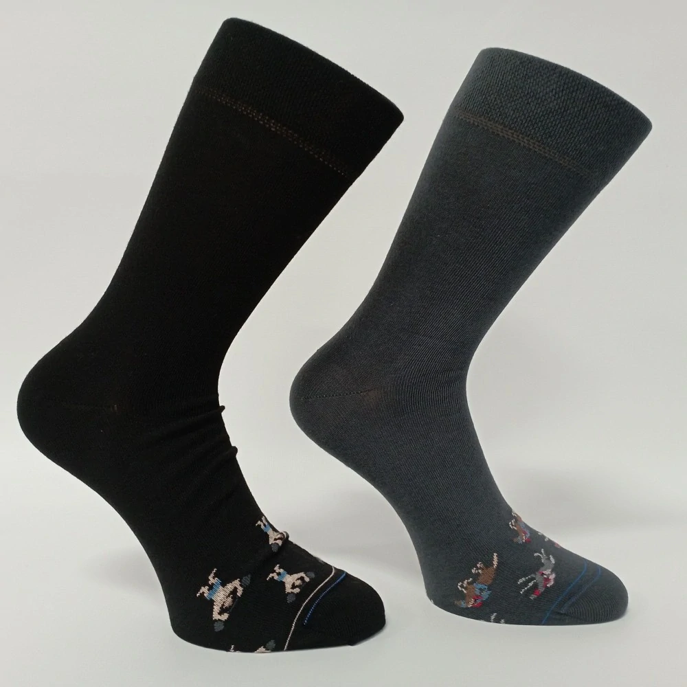 Společenské ponožky s decentní výšivkou u špice. Pohodlné nošení díky kvalitní dlouhovláknébavlně. Zesílené zátěžové zóny, špička ponožky je uzavřena plochým řetízkem. Pohodlný nesvíravý vaflový lem, který se přizpůsobí tvaru pánské nohy a nezařezává se. Tyto luxusní ponožky mají prodloužené lýtko, které zajistí, že Vám již nebude vidět odhalená noha při sezení. Velmi jemné a příjemné na dotek. Provedení v klasické černé a šedé barvě.