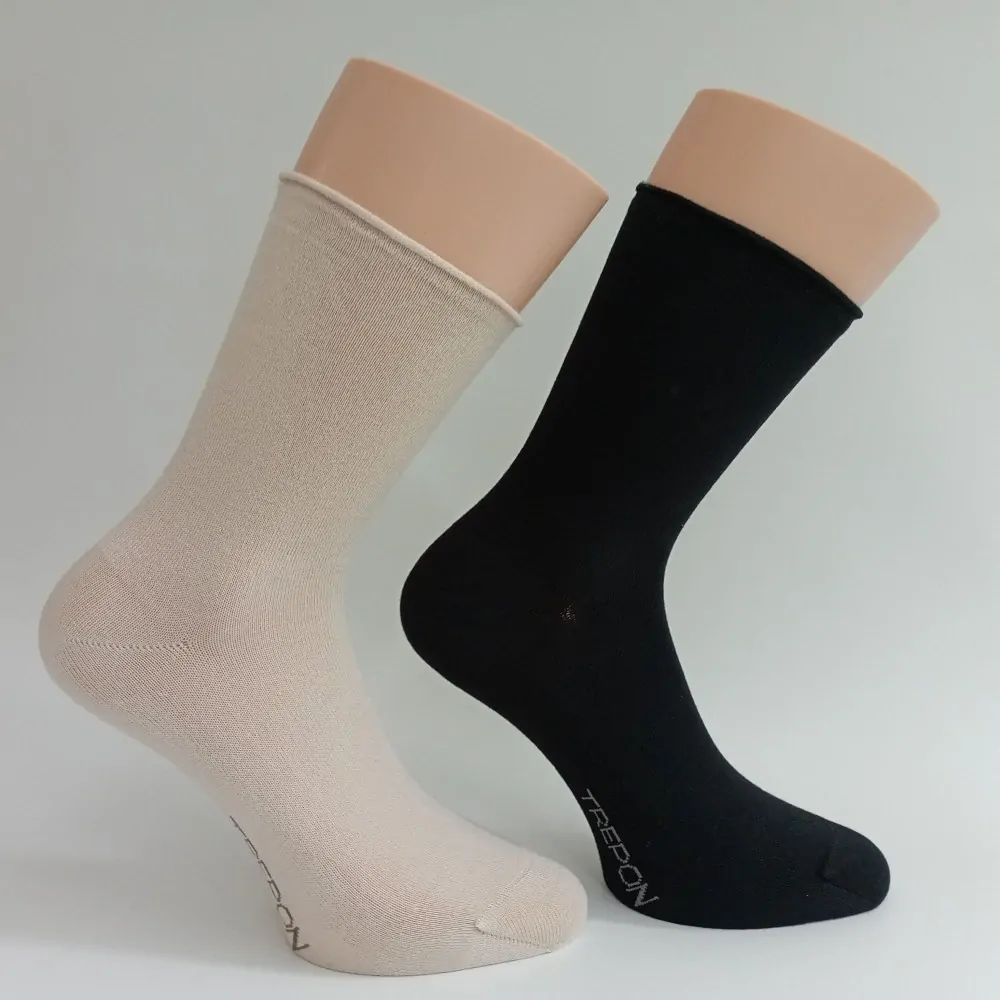 Zdravotní ponožky z bambusové viskózy s řetízkovanou špičkou a lýtka bez gumiček. Jsou jemné, měkké na dotek a prodyšné. Odvádí vlhkost, propouští vzduch - díky tomu pokožka dýcha a vlákno se nelepí na nohu. Bambusová příze je navíc velmi vzdušná a současně dobře reguluje teplotu, proto se v ponožkách nepotí nohy. Bambusová vlákna mají antibakteriální vlastnosti. Ponožky skvěle padnou díky přidanému elastanu, zátěžové části (paty a špičky) jsou zesíleny polyamidem pro delší životnost výrobku. Ponožky mají lýtko bez gumiček zakončeno ruličkou.