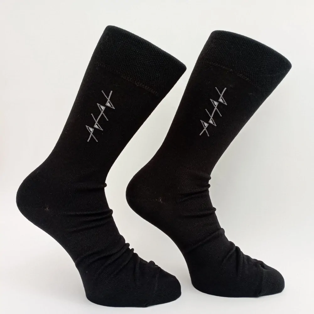 Luxusní pánské ponožky s decentním vzorem na prodlouženém lýtku. Prodloužená délka ponožek zajistí, že Vám již nebude vidět odhalená noha při sezení. Velmi jemné a příjemné na dotek. Pata a špice zesílená. Vysoký komfort při nošení díky kvalitní bavlně a přidanému elastanu. Ideální do společenské obuvi a k pánskému obleku. Ponožky jsou v klasické černé barvě.
