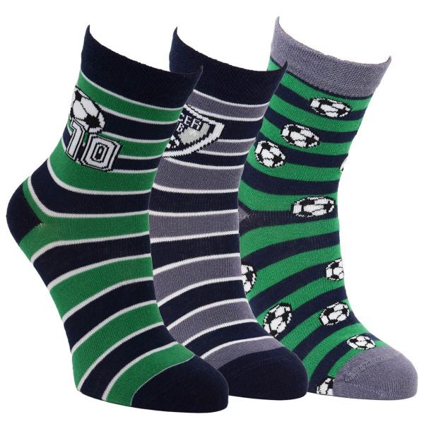 Dětské chlapecké barevné bavlněné elastické fotbalové ponožky. Tyto chlapecké ponožky s oblíbenými motivy fotbalu mají zesílené zátěžové části (patu a špici),jsou příjemné a dobře se navlékají. Plochý šev na špici. Balení: 3 páry. Motiv fotbalu. Barva: různobarevné - zelená, navy, šedá.