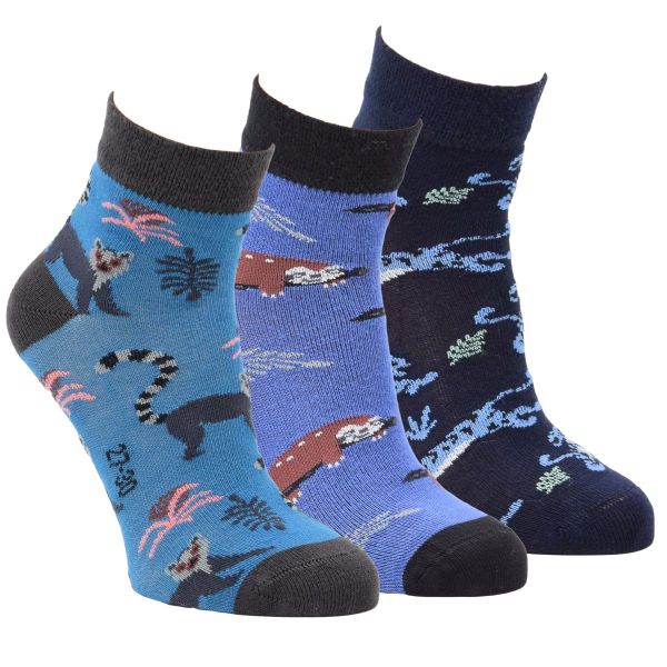 Dětské barevné bambusové ponožky s barevnými zvířátky. Chlapecké ponožky jsou příjemné,dobře se navlékají a díky zesílenému pletení v oblasti paty a špice vydrží déle! 3 barevné kombinace v balíčku (mix navy, modrá a tyrkys).