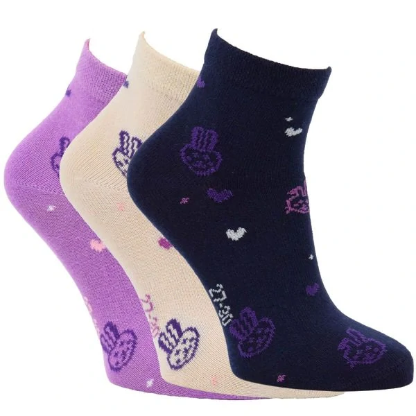 Dětské barevné bavlněné elastické ponožky se zajíčky a srdíčky. Dívčí ponožky jsou příjemné, dobře se navlékají a a díky zesílenému pletení v oblasti paty a špice vydrží déle! Ploché sešití špice, vysoký obsah bavlny, pohodlný lem. Balení: 3 páry. Barva: navy, fialová, krémová.