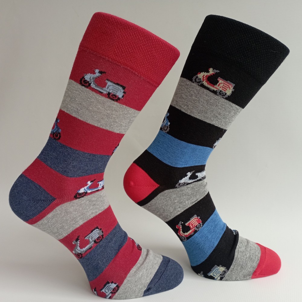 Pánské barevné ponožky s pruhy a motorkami. Mohou být originálním dárkem s motorkářskou tématikou, který určitě potěší. Osvědčený design a zajímavě zvolené barvy. Originalita, pohodlí, styl. Kousek s nápaditým vzorem, který stojí za oživení jakéhokoli outfitu běžného dne.