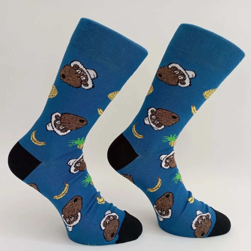 Opičení nebylo nikdy zábavnější! Tyto ponožky jsou perfektním doplňkem vašeho šatníku a dodají každému outfitu hravý nádech. Předveďte svou divokou stránku, když se houpete z větve na větev, a to vše při zachování pohodlí vašich nohou. S těmito ponožkami se budete cítit jako král džungle. Užijte si jedinečný vzor a barvy těchto ponožek, které jsou zábavné a okoření každý outfit. Oživte svůj šatník těmito odvážně stylovými ponožkami. Díky spoustě barev můžete předvést svou divokou stránku a zůstat v pohodlí! Ponožky jsou vyrobeny z jemné kvalitní dlouhovlákné bavlny a díky přidanému elastanu se skvěle přizpůsobí tvaru Vaší nohy. Mají komfortní piké lemy, které se nezařezávají. Špička a pata ponožek jsou zesílené. Špička ponožek je utavřena plochým řetízkem.