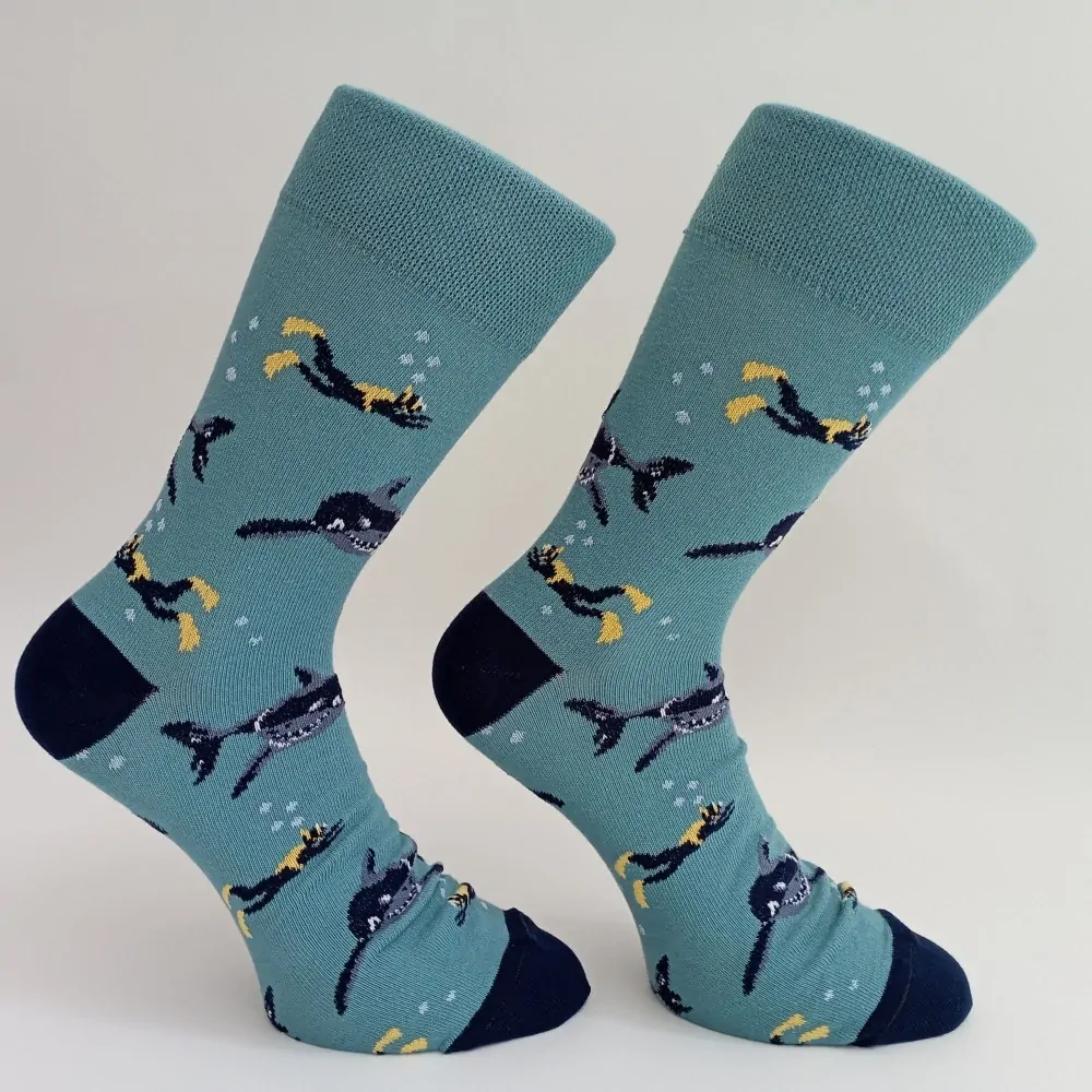 Kdo by nemiloval moře, ale dávejte pozor na to, co se skrývá pod hladinou. krásné mořské ryby dodají vašemu outfitu barvu a styl. Ať už tyto ponožky nosíte do kanceláře nebo kolem domu, jistě vzbudíte velkou pozornost. Nebudete muset lovit komplimenty! Užijte si jedinečný vzor a barvy těchto ponožek, které jsou zábavné a okoření každý outfit. Oživte svůj šatník těmito stylovými ponožkami. Ponožky jsou vyrobeny z jemné kvalitní dlouhovlákné bavlny a díky přidanému elastanu se skvěle přizpůsobí tvaru Vaší nohy. Mají komfortní piké lemy, které se nezařezávají. Špička a pata ponožek jsou zesílené. Špička ponožek je utavřena plochým řetízkem.