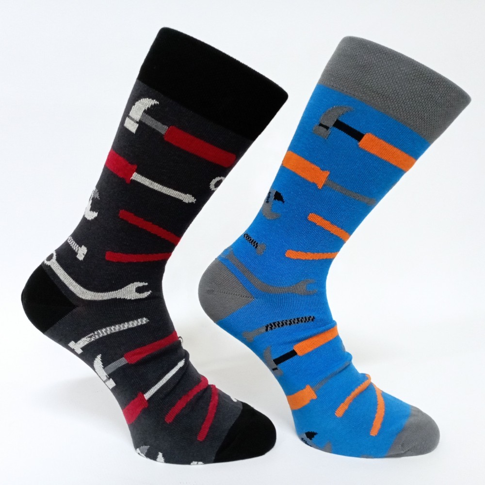 V každém z nás dřímá mistr, který ví, že správné nářadí dokáže zázraky. Tyto ponožky s motivem nářadí jsou pro všechny, kteří staví, opravují a tvoří. Kombinace kvalitní dlouhovlákné bavlny s elastanovým vláknem pro příjemné nošení a tvarovou stabilitu. Paty a špice zesíleny pro delší životnost. Extra plochý šev v oblasti prstů. Dvojité komfortní lemy – nesklouzávají ani se nezařezávají. V dámském i pánském provedení velikostí.