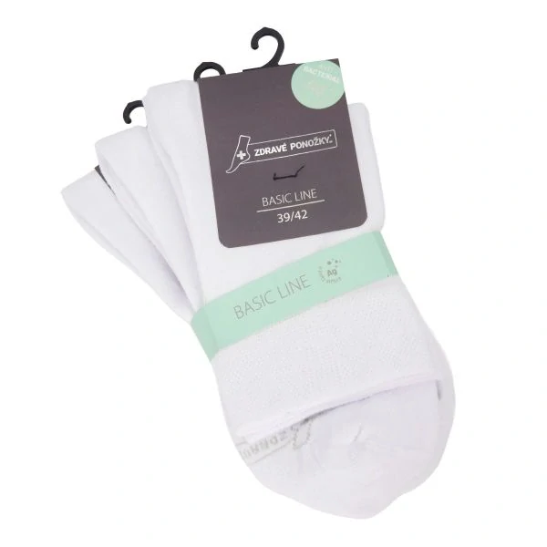 Dámské i pánské zkrácené hladké bavlněné jednobarevné ponožky s ionty stříbra určené k běžnému nošení i pro volný čas. Pohodlí zajistí plochý šev na špici (ruční řetízkování) a trvanlivost ponožek pak zesílení (zdvojené pletení) v oblasti paty a špice. Zdravé ponožky se příjemně nosí a nesjíždí. Skvěle drží díky své elasticitě a neškrtí díky pohodlnému vaflovému (dovnitř zapletenému) příjemnému volnému lemu. Balení 3 páry stejné barvy. Barva: bílá. Antibakteriální vlastnosti!