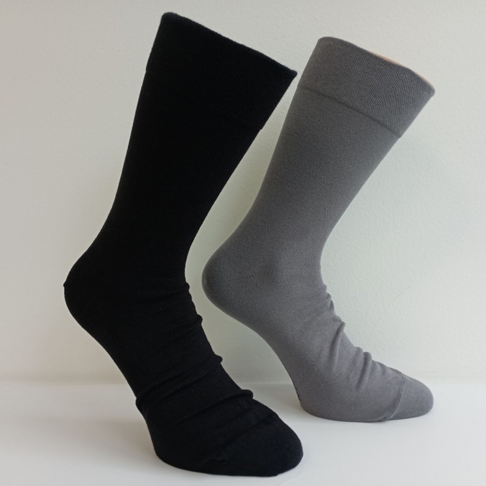 Klasické hladké ponožky pro osoby s větším obvodem lýtka a diabetiky. Jsou vyrobeny s 80% podílem kvalitní dlouhovlákné bavlny. Zdravotní vaflový lem zabezpečuje jemný svěr nohy, je tedy prevencí zaškrcení končetiny, přitom na ní dobře drží. Klasické, decentní a pohodlné. Zesílená pata a  ručně řetízkovaná špička přinášejí maximální pohodlí a optimální životnost výrobku. Tyto ponožky jsou tou nejlepší volbou, pokud kladete důraz na kvalitu, pohodlí a komfort při nošení! Ideální do společenské obuvi na běžné nošení.