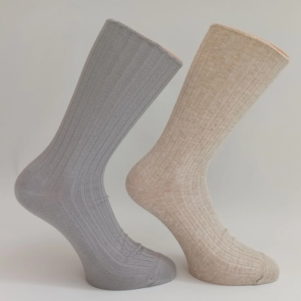 Zdravotní ponožky z kvalitní dlouhovlákné bavlny, lýtko bez gumiček. Lýtko a nár v je upleten v žebrové vazbě, chodidlo je hladké. Špička je sešita tenkým stehem.